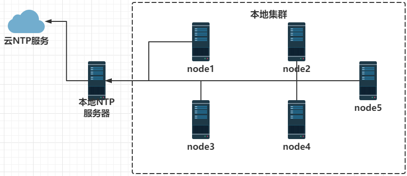 在内网中选用一个服务器当作本地NTP服务的Server服务器,Server服务器与云服务器时间同步。本地集群与server服务器时间同步。这样就算没有网络或者网络出现故障,本地集群的时间也会和Server的保持一致。