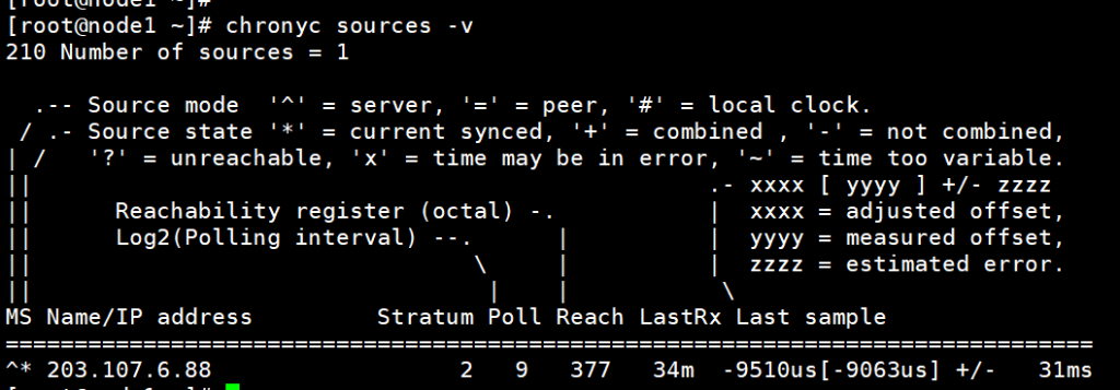 [root@node1 ~]# chronyc sources -v