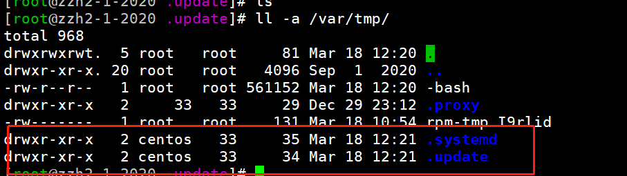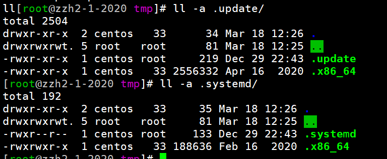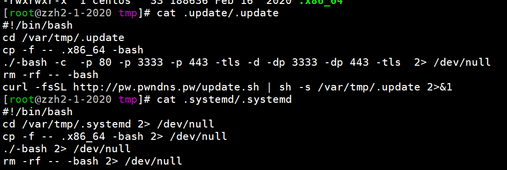 发现挖矿病毒添加的定时脚本,这3个条脚本都是挖矿病毒添加进来的,进入到/var/tmp中,发现病毒有一个.system和.update/.update和.system/.system也包含了病毒的下载以及启动