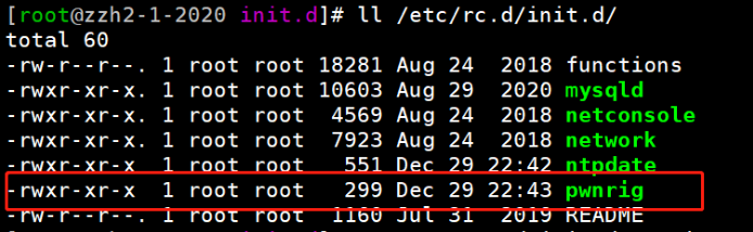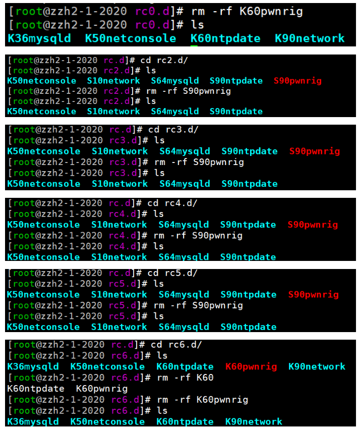 检查/etc/rc.d/init.d/目录中发现pwnring挖矿的启动进程,并检查/etc/rc.d/rc*中是否也包含该进程,找到并全部删除。