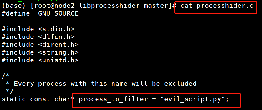 测试一下效果,代码中的evil_script是一个循环发送到某个服务器的恶意代码,libprocesshider.so文件是让evil_script进程看不见。这个阅读下processhider.c文件就可以知道。