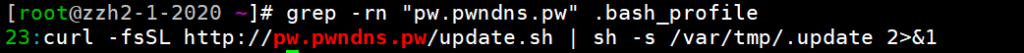 检查 文件中是否包含挖矿脚本使用命令为grep -rn “pw.pwndns.pw”(通过前面的shell发现,挖矿病毒是从这个域名下载的,所以可以简单匹配下)
